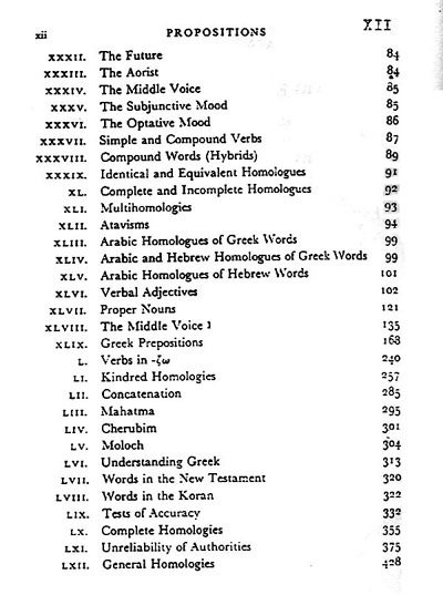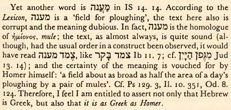 «Actually, the whole complex is consistent and only consistent with two propositions, that is: that biblical Hebrew is Greek, and that the Hebrews were Asiatic Greeks. In fact, the outcome of my laborious, extensive and elaborate research may be summed up in a brief sentence: Hebrew is Greek with a mask on.» «what I want to prove is